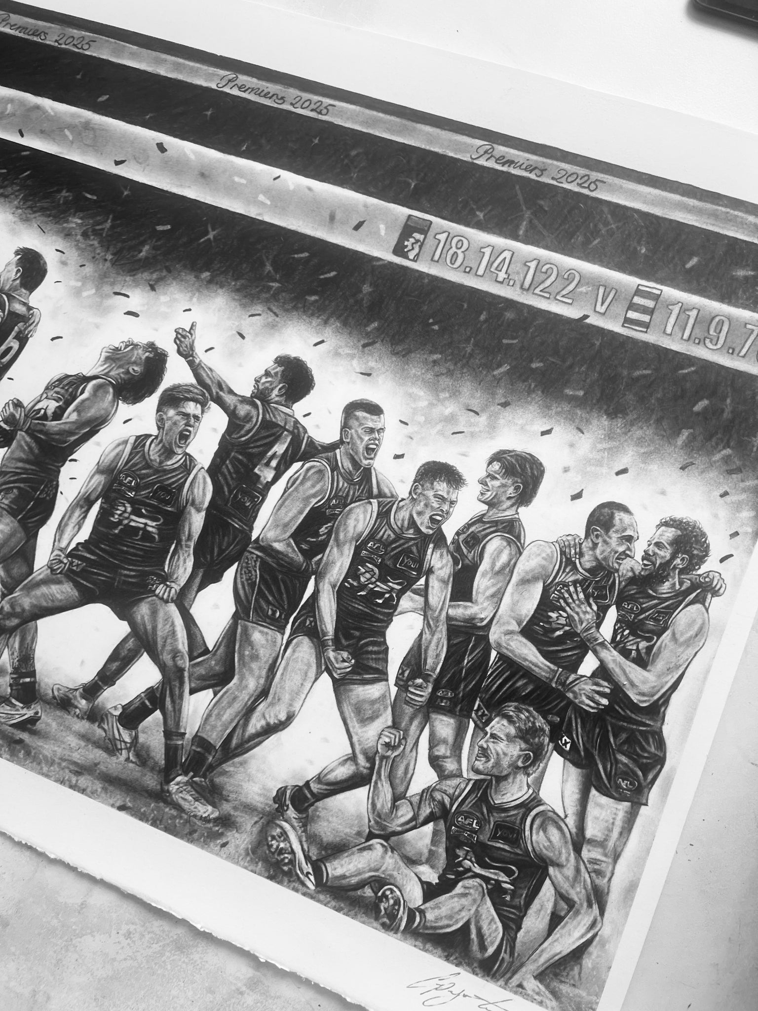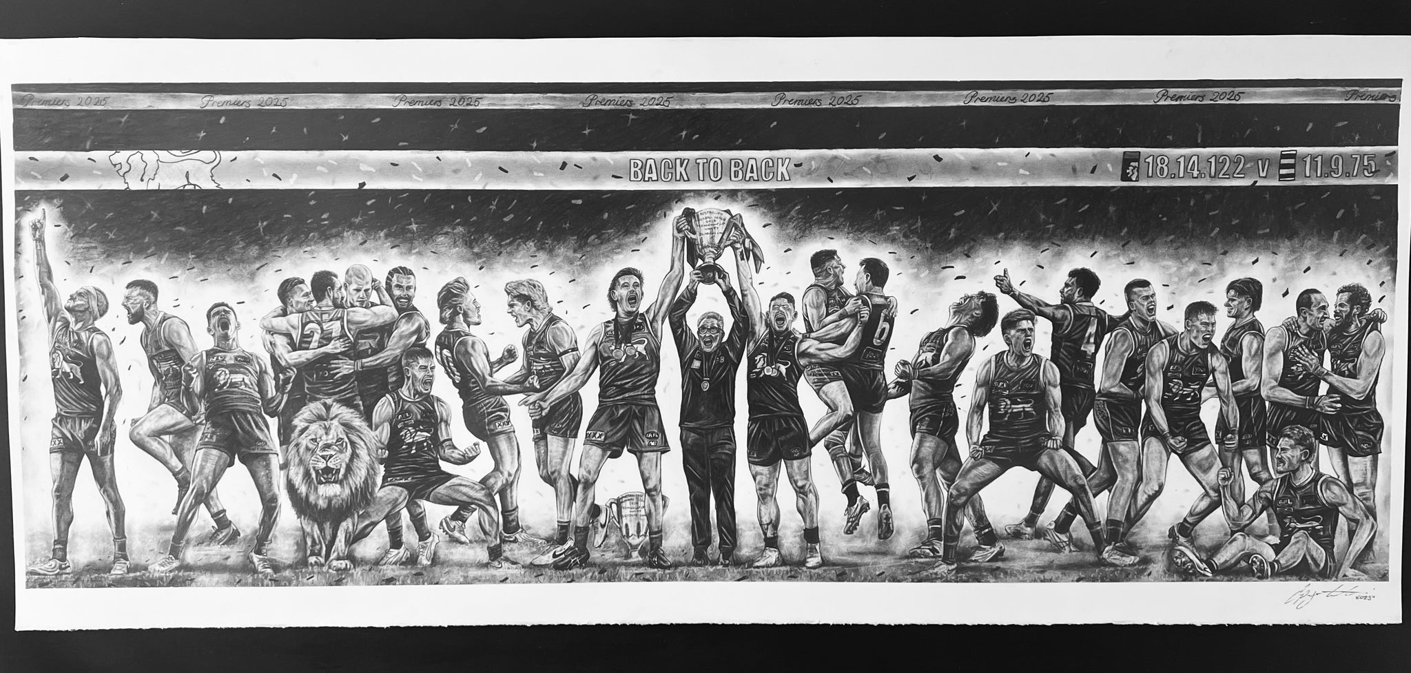 Celebrate history with ‘Back to Back’, a detailed hand-drawn tribute to the Brisbane Lions’ 2025 Premiership. This limited edition print run is capped at 100 prints, each hand-signed and individually numbered by the artist.